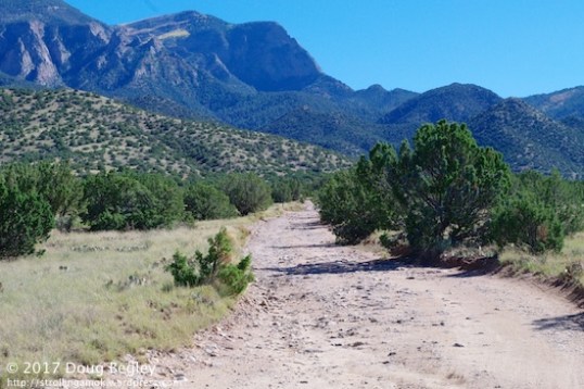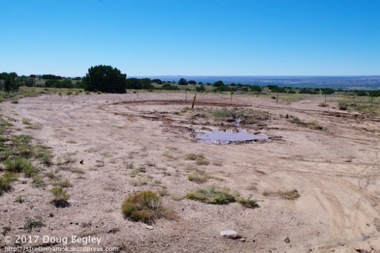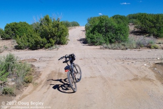 And slope it does. Not aggressively, just persistently. With two days and three nights of rain coming on quickly, the forecast is for more than 3/4-inch in total. I remember camping on a slope near the Bonneville Salt Flats, Utah, watching a mini-tsunami rolling down the road. This trail has a lot of water diversion cuts in it, which are intended to discourage just such a scenario, the problem being that square miles of slope – not square acres – can capture a heap of water in a short time. Such a flash flood can do much naughtiness to dirt roads and anything else in the way, the main problems being severe erosion and deposited debris. With any luck, there will merely be a stuttering series of moderate rains rather than a big dumperoo. That’s obviously what’s most likely. It’s just that when you’re driving past so many diversions per any given distance, it makes you think about whether your existing priorities in selecting a campsite need a temporary change-up in order to accommodate upcoming weather forecasts.
