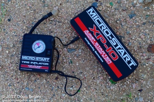 But how to re-inflate them in the finest Lazy Man way? The hand pump on the Evelo’s frame would eventually work, but also violate my principles. It’s for adding a few pounds, not taking two tires up from scratch. The Viair pump that I use for airing up the Mighty Furd’s tires at the end of its off-roading adventures would certainly do, but that’s a significant deal to set up just for two lousy little bike tires. Then the clouds parted, a bright light shown, and I dimly recalled that hey, I’d invested in an Antigravity Batteries Micro-Start XP-10 lithium battery at the Overland Expo West this year, and had also taken advantage of their tiny light-duty air pump for something like $16 more as a “Show Special!!!” One can’t expect too much from such deals, but it was in the truck cab waiting for just this type of task.