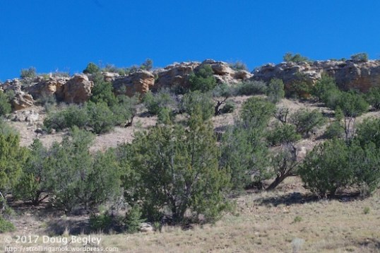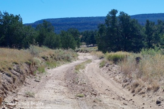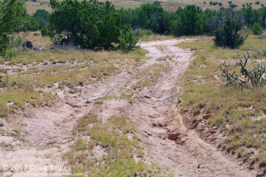 My getting through during the day’s walk was especially easy, since the gate was left open. That’s not normal, as the rule is to leave any gate as you find it. So, I left it open. Just a hundred feet or so in, I began to hear a clanking and pounding that was getting louder. Vehicle coming. Vehicle coming and getting the crap knocked out of it, by the sound of it! I stepped up and off to one side to observe. Weird. Young woman and maybe a 10-year-old kid riding shotgun in what might have been a 15 or 20-year-old Chevy pickup. Zoom! At the gate, she stopped, the kid jumped out, and he worked to stretch the wire to close it. Then, they were off. What their mission had been – unknown. Not much was in the bed, just a large bin and some waste/junk getting scrambled.