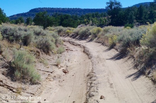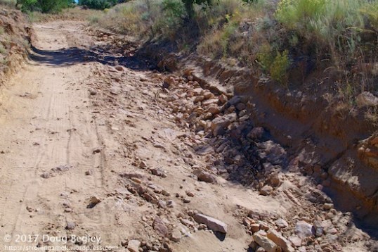 Now I wondered what this road accessed, how far in they had gone, and why. Long walk short, they had gone in pretty far, judging by the tracks left in the sandy parts, and over trail sections that would make a suburbanite on high-pressure tires uneasy. So this sure wasn’t their first rodeo on this road. Very obviously locals, since nobody would do what she was doing to her truck without help being just a phone call away. The further in I walked, the more reason I discovered for all the noise.