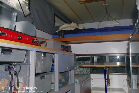 This started out as an affordable shell model, and they built it out with a counter, with cabinets and wire bins on slides. They drop a stick down through them to prevent movement during travel. There’s a 12V front-door Engel compressor refrigerator/freezer built into another counter on the other side. Considering they started with nothing, this is one very impressive build. In turn, they wanted to inspect a more current production Four Wheel, and cooed over the Grandby’s furnace and sink setup. It hit a low of 26 degrees one night here, so the furnace on a thermostat makes the difference between hardship and livable for me.