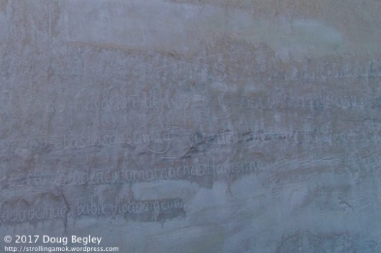 Most of the carvings are almost too shallow to read now, due to erosion. In something like 1926, the Park Service ground off inscriptions later than 1906, of which there were many. The majority of the earlier ones are by early Spanish administrators, neatly done in paragraphs of grandiose language. One was done on behalf of a governor who magnanimously declined to attack the native pueblo because they decided to offer no resistance to subjugation.