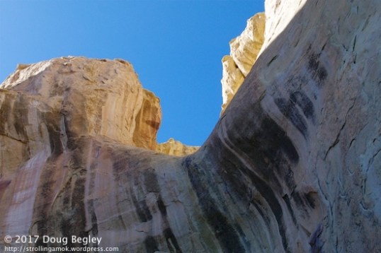 Desperate men do desperate things, so I carried my trusty aluminum water bottle with me as I walked in and checked things out. Two miles, yup. A least two hundred feet up. But there were remnants of a pueblo up there, and I wanted to see them. Everybody starts with the historic rock vandalism first, but the tougher rate of climb at that end made me think that I’d better do the loop backwards. The excavations were closer to the opposite end anyway. The full loop normally takes an hour and a half. Between the climb and not knowing what that top deck was like, I knew it would take me much longer.
