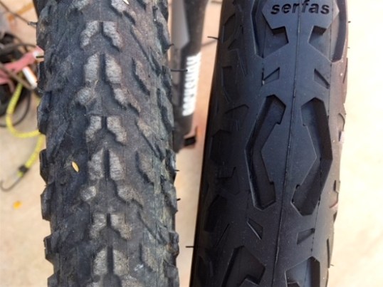 The front Michelin (left) hasn’t actually worn much. Obviously, the new Serfas is on the right.
