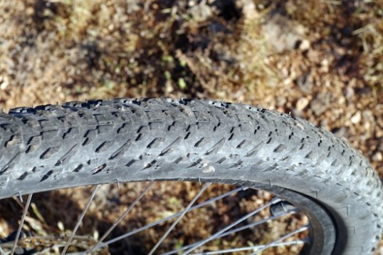 My goal in tire selection was to either find one with a tall tread and a center rib, or one with more ground contact, or both. Aftermarket bike tires today are all thin tread, because mountain bike enthusiasts today all tend to want something akin to racing tires. That means thin treads to lower weight and reduce rolling resistance, and very open tread designs for better grip on loose surfaces. Today, bike tire manufacturers all cater to these selling points because it draws in the bulk of of bicycle hobbyists who do not compete, but are saddled with the vestiges of a warrior mentality – warriors who wear Lycra with advertising all over it, which makes them feel like they’re sponsored pros, or could be. Now I’ll admit that a good (read: $$$$) bike feels like a tuning fork instead of a hammer, and reducing the rotating mass contributes significantly to that but, once you start depending on a bicycle for transport duty instead of joyriding, priorities shift, and flimsy racing tires are about the last thing you want to have to deal with. Okay, maybe Lycra is, but the point is that “dependable” outranks “fast” for mortals like myself, and the online aftermarket pickings are slim.
