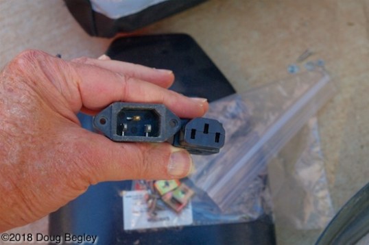 A unit from a Chinese outfit that branded it “Vpower” fit the bill, and frankly was the only battery I’d found that uses standardized connectors in a way that required only minimal brain power to implement. It’s almost plug & play. Almost. It uses the same round “XLR” charging connector with the same polarities, and so can use either one of my two small chargers in place of the 6A one that shipped with it. The only reason it isn’t plug & play is because Evelo pulled a fast one on their harness connector, which links the battery to the bike’s drive and control systems. The new Vpower battery uses the same IEC 60320 C13/C14 connector that many e-bikes, most desktop computers and many appliances use. It has three blades all oriented the same, but out of line with each other. Evelo uses what amounts to being a proprietary plug in which the center pin blade is at a right angle to the other two, preventing a connection.