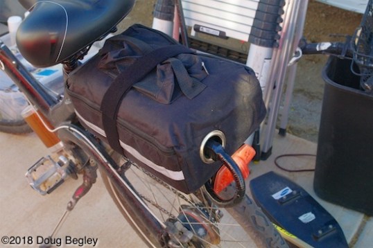 At a distance. This bag looks big enough to house Vpower’s most powerful battery. It could also likely absorb the tool kit bag now on the handlebars, as well as a change of clothing and some camping equipment. It’s an overnight bag with a battery in it.