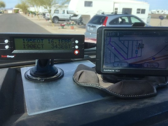 The ScanGauge II is on the left. The values it displays vary with engine speed and load. The screen is actually easy to read – the iPhone insisted on exposing for the outside brightness, and I didn’t have the smarts to turn on its built-in flash.