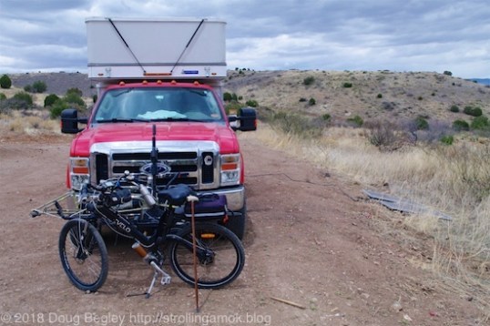Among the wanderers who drove past was a couple of younger women in a big-tire Jeep who were out for a fun day of touring. They saw me outside and wanted to know where I hailed from. I must look pretty harmless, I guess. Anyway, they seemed impressed by seeing any form of RV up here. I assume that they’re used to seeing all the motorhomes and big trailers clustered in the easy-access places around Thousand Trails Road, and seeing a rig up here somehow planted me in the Adventurous category. Why did I choose here, they asked me. Most of the passers-by I’ve encountered were surprised that this area was okay for camping on, probably since most are locals who just use it for tootling around on. So I summed up my answer with the relative solitude and open space, the great view, and the absence of generators, barking dogs, and sardine can stack-ups. They got it. This is how it’s supposed to be, when you have a rig that can get you to places like this to camp. Whatever your particular rig is best at, take advantage of those qualities and enjoy them.