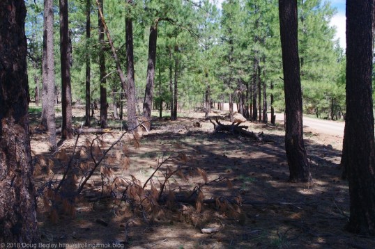 Morbid curiosity had its hand in, once I made a start at pedal-touring the road above the switchbacks on NF-535. Up top is a different story entirely. I decided to pack up the camper and crawl all camping-approved areas as noted on the MVUM. So I idled down a branch at a water hole, which they refer to as a tank out here. 9018H goes straight west and cuts through an area where the forest shows signs of having been deliberately thinned out. The road itself is plain dirt, deeply rutted for very long spans, and occasionally troubled by patches of retained water that forms mudpits. Fortunately, the mudpits can be skirted. Oddly, former campsites abound within the prohibited quarter mile of the tank. Further west, they are a real rarity. I found three along the entire “legal” run, all of them on open ground.
