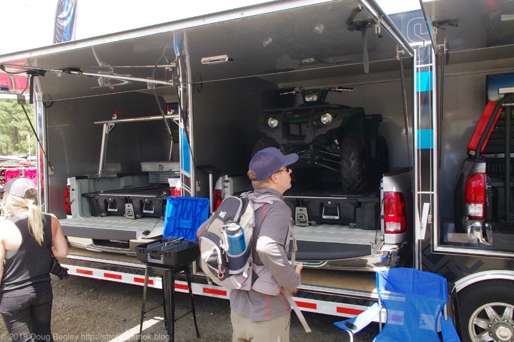 A trailer with four bays had me stumped for a minute as to what they were selling, due to a large-screen multimedia display and pounding music in the first bay I saw that first made me think that that’s what they were pushing. Electronics. But that made no sense. A truck bed in each bay held varying equipment and, stepping around to the side bays, I eventually noticed the common denominator of long-drawer storage. Okay. Somebody’s Marketing budget is just way out of control!
