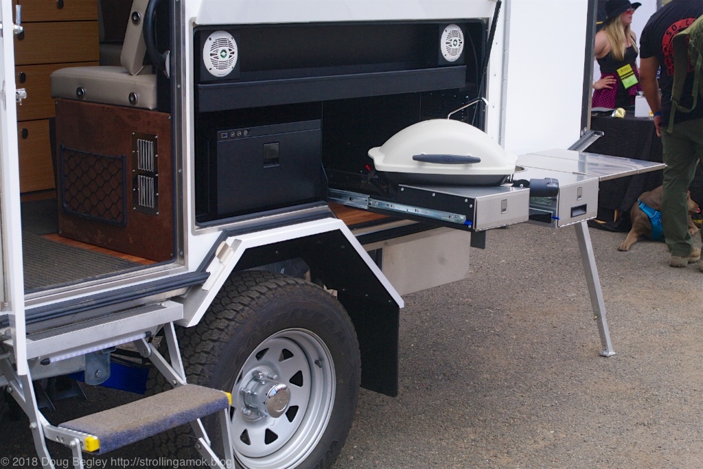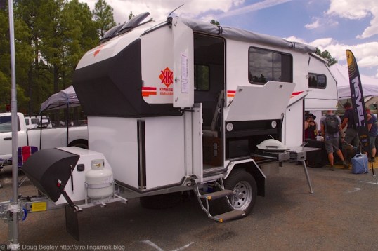 A Kimberley Karavan Eco Suite from Australia, a duplicate of what my first neighbor had up in the Expo’s dispersed camping area. A small, full hardside, the top section collapses down for travel, and a generous rear bed platform retracts in as well, making for a compact 3,500-lb package for the trail. Off-road, the smaller the better. This really isn’t much bigger than a basic so-called adventure trailer.