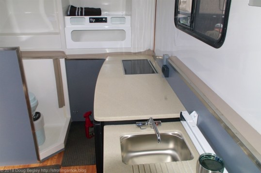 Kimberley’s price for this tiny, robust rig is a staggering $90,000, which quickly evaporates any interest from us retired Boomers weaned on industrious personal effort and now switching over to self-indulgence as a reward. Yet, like the Black Series trailers in my previous post, “value” in the Australian mind is apparently based on different things. In place of granite countertops are features that aid function and longevity. Standard features include a hot-dipped galvanized steel frame of ample size, separate hot and cold stainless steel water tanks instead of plastic, high-clearance independent air-bag suspension with an adjustable compressor, hydraulic disk brakes with parking brake, a 550W rooftop solar system feeding a 200Ah lithium battery, induction cooktop, diesel-fed heating system, and a pump system that allows replenishing the water tanks with filtered water from streams or lakes. No doubt the induction cooktop runs off the 2,600-watt inverter. The structural materials consist of stainless steel, fiberglass, and to control weight and greatly increase panel stiffness, bonded aluminum honeycomb panels. I once saw early versions of the latter in the 1970s, and they were feathery in weight, yet allowed structural designs that simply could not be done by any other means and still function, which overruled their premium cost. Incredibly stiff.