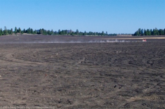 Driving over them makes for an interesting hissing sound as they try to squirm out from under the tires, and I imagine that the extra power needed to push through must have overheated one or two ATVs over the years. Walking on them produces a pea gravel crunch that’s like listening to the soundtrack of a murder mystery show, where someone is walking on the gravel drive of a British manor house. Crunch, crunch, crunch. This absorbs enough extra energy that you’ll find yourself preferring to find a suitable tireprint to follow. The other thing such walking produces is fine dust wafting all over your shoes and lower extremities. By the time you get back to your rig, it’s time to consider just what mixture of dust and cinders you want to bring in with you, if any. You always have the choice of walking along the road instead, which is an easier go. On a holiday weekend however, the clouds of dust from passing vehicles makes that option unpleasant.
