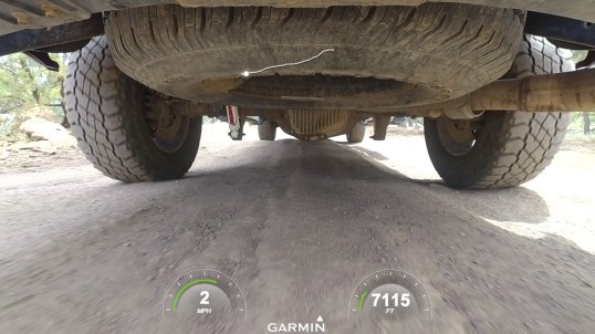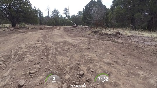 Huh? White, branded shock absorbers from a new car dealer? Don’t mind the squiggle at top center – that’s the VIRB’s default display that indicates where you currently are along the recording’s total path. (It has a GPS sensor.) Here, I’m just beginning to head east on a trail.