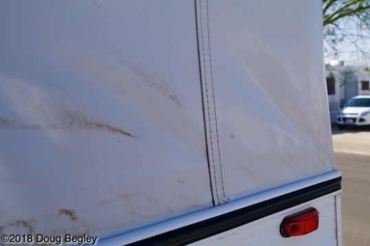 One task that’s never mentioned with pop-up truck campers is cleaning the flexible fabric walls. That’s probably because there’s no glamor in it. But, it has to be done, and sooner rather than later. Today’s little exercise shows what happens when you don’t or can’t keep up with it. See, weekending with a Four Wheel tends to create minimal soiling issues with the fabric walls, and cleanup is easy using only a rag, water, and perhaps a very mild cleaning agent. A quick once-over does the trick.