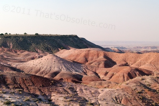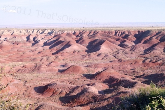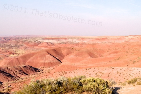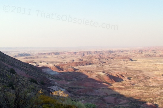 Tuesday, October 23rd was my first full day of touring the Petrified Forest National Park. I’ve mentioned the driving views from the road that goes through the park. Maybe it’s the economic depression that we don’t officially have, but not many people are at the park these days. I’m told that the prime season ended in September. At any rate, traffic along the roadway is almost nonexistent. For the sake of really taking in the scenery, that’s good, because there are very few places to stop at roadside, since there’s no room for a gravel shoulder. When you want to stop and gawk or take a holiday snap, you have to barely drop two wheels off, or just stop as-is. Either way, you’re blocking your lane. With no one in sight for several minutes, this is not an imposition.
