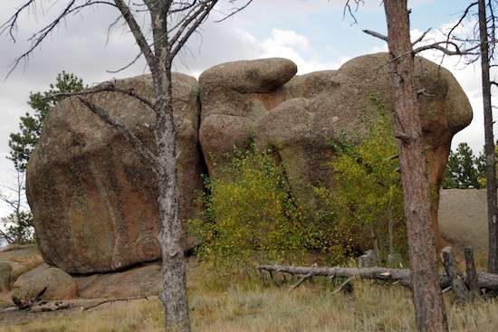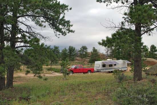 Another double-length drive through Nebraska got me to the Medicine Bow National Forest in Wyoming, at sunset. To boondock there, you go past the entrance for the Vedauwoo Recreational Area, which is a very nice paved campground and picnic area, with walking paths right up to some of the finest climbing cliffs I’ve ever seen. The day use area costs $5/day, and camping (without any hookups) is $10/night. I’m not dead sure any of the spaces will fit the Defiant, but there is some accommodation for larger rigs.